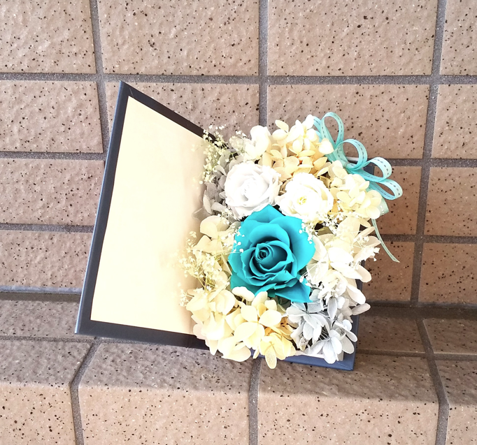 本日は~ 本の型をしたフレームにプリザーブドフラワー(枯れないお花)をアレンジしてみましたー(^^♪